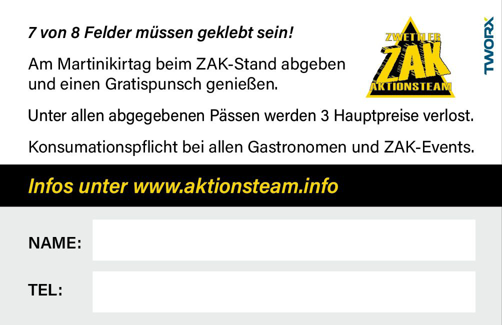 Und obendrauf bekommst du mit einem vollständigen Sammelpass (7 von 8 Aufkleber sind nötig), beim Martinikirtag, bei unserem ZAK-Stand ein Heißgetränk gratis.
